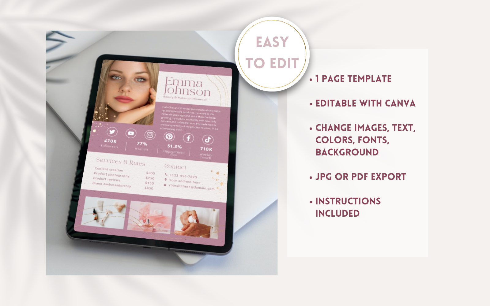 Description : This Beauty Influencer Media Kit is for the women out there who want to level up and show their most attractive professional side.