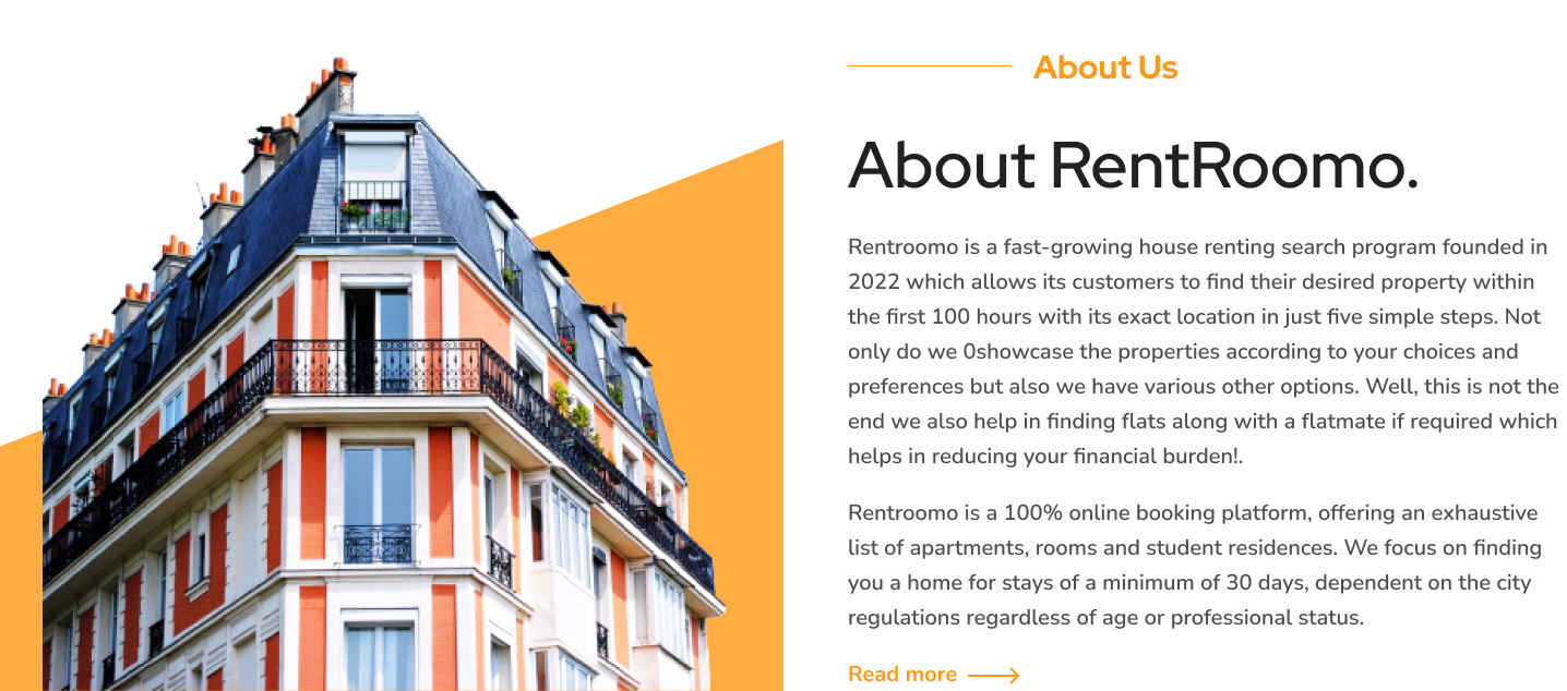 Description : 41: Room Rent is a fast-growing house renting search program founded in 2022 which allows its customers to find their desired within the first 100 hours with its exact location in just five simple steps. Not only do we 0showcase the properties according to your choices and preferences but also we have various other options. Well, this is not the end we also help in finding flats along with a flatmate if required which helps in reducing your financial burden.