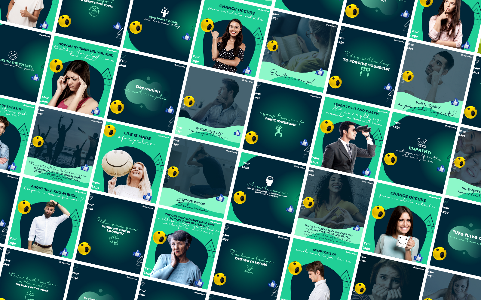 100 professionally designed Psychology Social Media posts for Psychologists, and Digital Marketers to attract new leads, grow followers, and close deals.