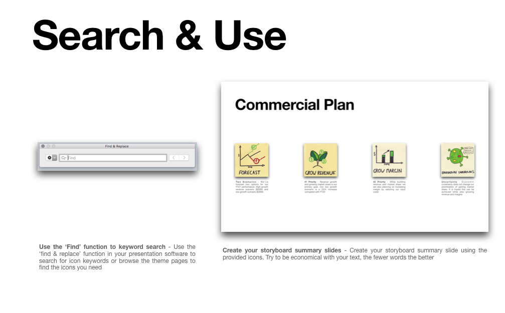 Additionally the icons can be used to build engaging story boards to summarise strategic, marketing and business plans.