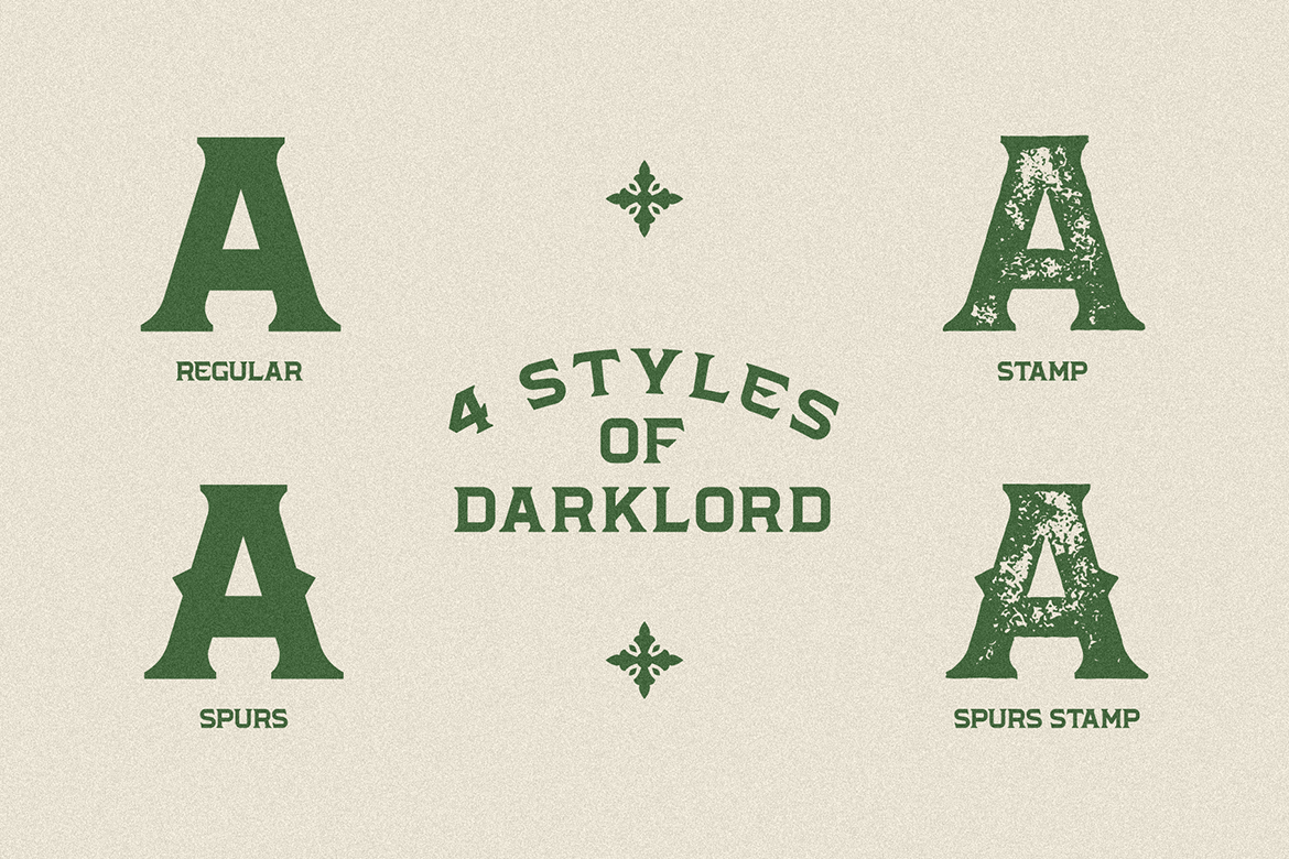 Short description : Darklord is inspired by the old-fashioned era. The Darklord font is a heavy-weight semi-serif font from the vintage style. Four varieties are available: Regular, Stamp, Spurs, and Spurs Stamp. The use of this font results in carefully-crafted styles.
