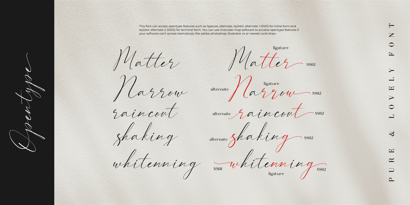 Short description   :     Introducing Pure and Lovely is pretty calligraphy font, this font is inspired by an organic handwritten. Pure and Lovely font has OpenType features such as ligature, alternate, stylistic alternate 1 (SS01) for initial or beginning swash, and stylistic alternate 2 (SS02) for the terminal form or ending swash, you can customize to make more pretty and elegant looks. Let's use this font in your project design for logo, branding, invitations, greeting card, headline, title, magazine, signature and etc.