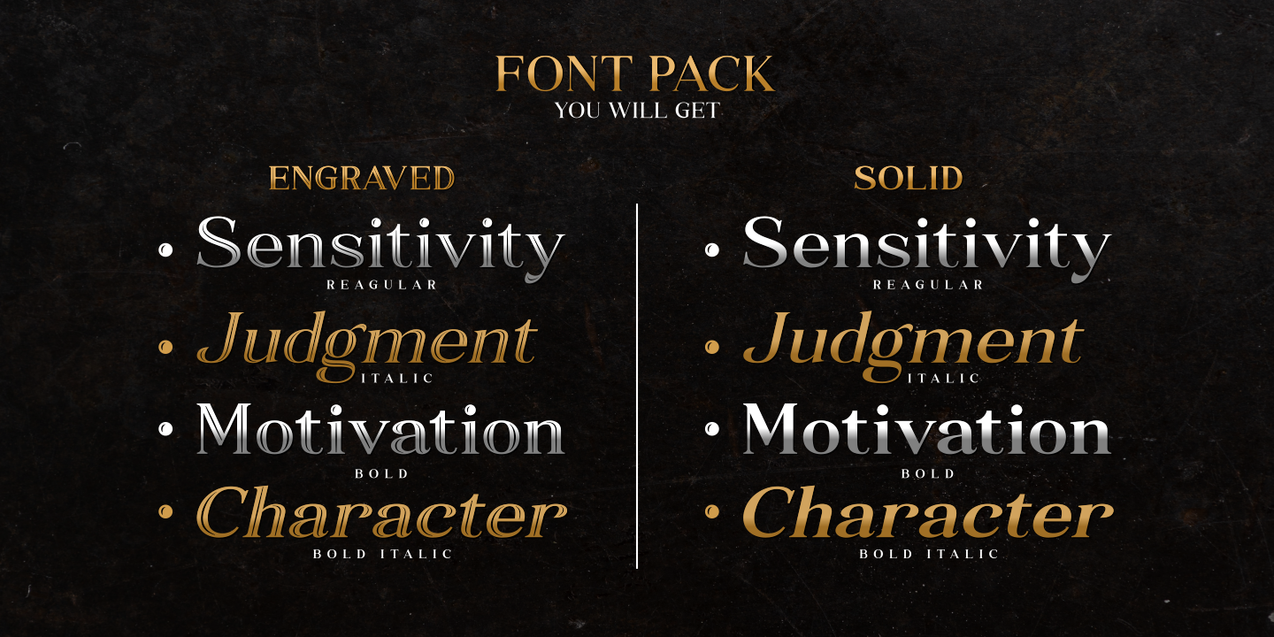 Short description   :     Proudly present the newest product called Craved Story Font. In the design process added engraving to every detail of the font character to create a stylish and elegant impression so your design project can make more outstanding. Craved Story Font is also perfect for use in vintage-style projects. In the package of this product, you'll get engraved and solid font so you can mix and match for your project.