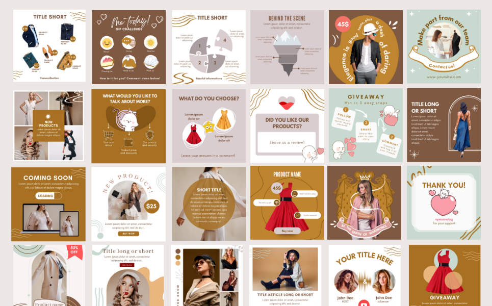 - CANVA Company template (behind the scenes, our team, followed, event, quote, sneak peek, site & app promo, brand ambassador, assumption about us, goals, accomplish, happy birthday, in vacation, contact, good night, good morning, FAQ, launching, price list, ask me something, good news, grateful, reminder ) - 32