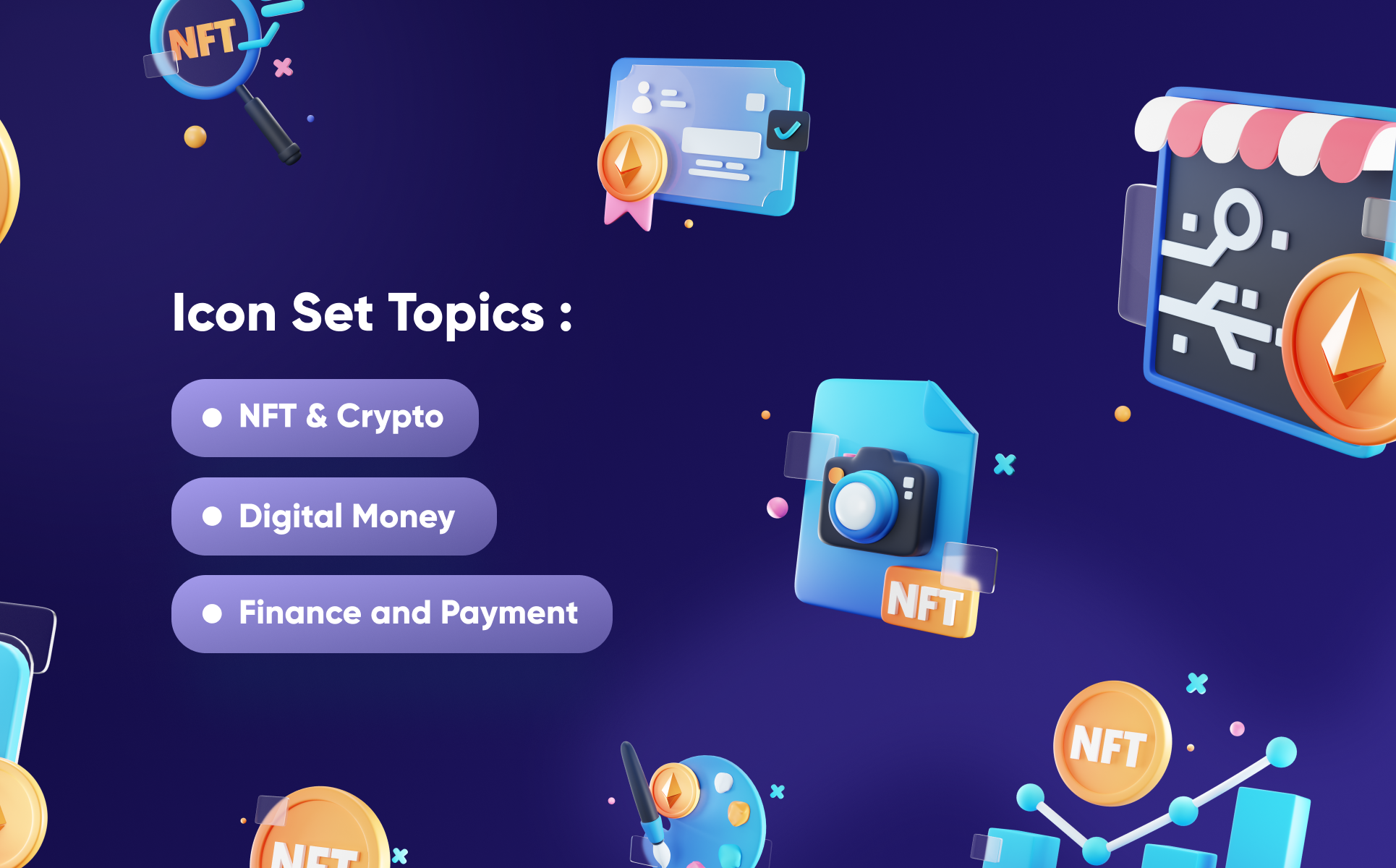 Excerpt : Modern, unique, and creative NFT digital investment 3D icons set is suitable for banking, finance, digital finance, or fintech industry design needs